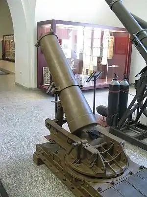 The 26 cm Minenwerfer M 17 was a heavy trench mortar used by Austria-Hungary in World War I. It was developed by Skoda as an alternative to copying captured Italian 240 mm Trench Mortars. Skoda presented two versions, one with a rigid barrel, and the other with a recoil system. The former was chosen as it was simpler to produce. It was a muzzle-loading, rifled mortar that had to be levered around to aim at new targets. It disassembled into four pieces for transport.