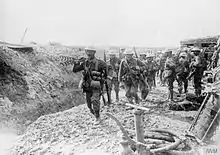Passing through the Mediterranean port of Marseilles the 29th Division arrived in the rear of the Somme battle front from 15 to 29 March 1916.[9] From this time the Division was put into the British Front in the area north of the Ancre River, near to the German-held village of Beaumont Hamel. For the following three months the battalions in the Division spent their time doing tours of trenches and training behind the lines to prepare for the large British offensive against the German position planned for the end of June.[9] Following a 7-day artillery bombardment of the German Front and Rear areas, the battalions of the 29th Division were in position in their Assembly Trenches in the early hours of Saturday 1 July.[9] At 07.20 hours the huge Hawthorn mine was blown on the left of the division's position. The leading battalions in the attack left the British Front Line trench at 07.30 hours.[9] The British casualties were very heavy, with many men never reaching the German Front Line. The men of the Newfoundland Regiment moved forward at about 09.00 hours to follow on behind the leading battalion in the advance of 88th Brigade.[9] Many of them were shot down trying to clamber overground to cover the few yards from where they were in the rear of the British Front Line to start their advance down the hill.[9]
