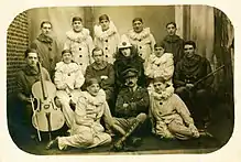 The Diamond Troupe was the Concert Party of the 29th Division. The Diamond Troupe was one of a small number of concert parties to achieve considerable notoriety, both on the battlefield and at home. The members of the troupe were: Front row (from left to right): Pte. Eric John Dean, Lt. Col. E. Trevor Wright, Pte. Lawrence Nicol. Middle row: Pte. Hubert Holmes (cellist), Corp. Frank Pollard, L. Cp. Robert James Stannard, Pte. William Threlfall, Pte. Arthur Sykes, Pte. H. Palmer (violinist). Back row: Pte. Neville Giordano, Pte. Jock McKinley, Pte. Alexander Hill, Pte. George Hangle, Pte. J. Morris.
