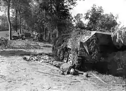 It landed at Omaha Beach, Normandy, on 11 June 1944, five days after the initial D-Day landings of 6 June 1944, secured the Vire-et-Taute Canal, crossed the Vire River on 7 July.[6] Beginning on 25 July, the 30th Division spearheaded the Saint-Lô break-through of Operation Cobra, which was intended to break out of the Normandy beachhead, thus ending the stalemate that had occurred.