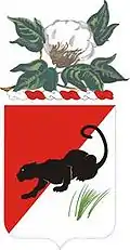- Symbolism: Scarlet and white (silver) represent the Cavalry branch. The panther embodies the qualities emphasized by the motto, "Swift and Unseen." Black denotes strength and solidarity. The paws and claws terminating the motto scroll symbolize tenacity and a readiness to fight. The green of the scroll and shrub on the shield signify growth and the land which is a traditional cavalry environment. Scarlet also denotes courage and sacrifice.