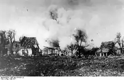 Once out of the line the division began training for offensive operations. 31st Division took part in Operation Borderland, a limited attack on La Becque and other fortified farms in front of the Forest of Nieppe on 28 June, in what was described as 'a model operation' for artillery cooperation.[35][36][37][38] Individual units continued to make small advances through aggressive patrolling and seizing strongpoints (so-called 'peaceful penetration') until the Allies began a coordinated offensive in August. The division captured Vieux-Berquin on 13 August 1918 and pushed forward until running into serious opposition south of Ploegsteert on 21 August, where fighting continued into September.[6][39][40]