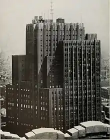 In August 1929, New York Telephone paid the city $300,000 for two lots along the eastern sidewalk of the Sixth Avenue extension.[34] Voorhees, Gmelin & Walker—renamed from McKenzie, Voorhees & Gmelin[35]—submitted plans for adding two 27-story annexes and a penthouse to 24 Walker Street in September 1929. The extensions would have a similar design to the existing structure and would take up the remainder of the block between Sixth Avenue and Walker, Lispenard, and Church Streets, except for a chamfer at the building's northwestern corner. The floor area would be more than doubled, from 400,000 to 812,000 square feet (37,200 to 75,400 m2).[36] The expansion was estimated to cost $6–7 million[20][37] (equivalent to $89–104 million in 2019).[38] This was part of a $600 million expansion plan that New York Telephone planned to undertake between 1930 and 1934.[39]