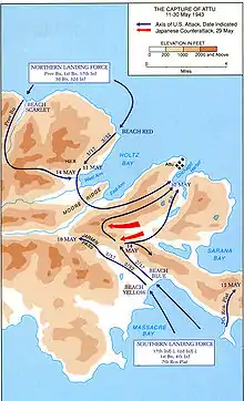World War II: Aleutian Islands (with arrowhead); Eastern Mandates; Leyte (with arrowhead); Ryukyus (with arrowhead)