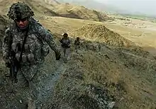 In March 2011, the 1st Battalion, 32nd Infantry again deployed as part of 3rd Brigade Combat Team, 10th Mountain Division, this time to Kandahar Province, southern Afghanistan, in support of Operation Enduring Freedom XI-XII under the command of Lieutenant Colonel (later Colonel) Kenneth J. Mintz.[1] The battalion was a battle space owner in the western portion of the Zhari District, replacing the 2nd Battalion, 502nd Infantry Regiment of the 101st Airborne Division. The battalion's area of operations included the villages of Nalgham and Sangsar, the spiritual heartland of the Taliban and the hometown of the Taliban's founder, Mullah Omar. Throughout the deployment, the battalion was headquartered at FOB Howz-e-Madad located on the north side of Highway 1, with Alpha Company at COP Ahmed Khan, Bravo Company at COP Sangsar, Charlie Company at COP Nalgham, and Delta Company at COP Zarif Khel. Soldiers from the battalion conducted a series of successful "Steel Lion"[2] operations, fighting south to the Arghandab River to isolate the Taliban insurgents from the population, secure the area through the construction of numerous strongpoints manned by US and Afghan security forces, and bring relative stability to the area.[3] Additionally, Soldiers from the battalion worked shoulder to shoulder with the Afghan National Army, Afghan National Police, Afghan National Civil Order Police, and stood up several new elements of Afghan Local Police, before redeploying to Fort Drum in March 2012. During this deployment the battalion suffered fourteen Soldiers killed-in-action (KIA), half of the brigade's total KIA casualties.