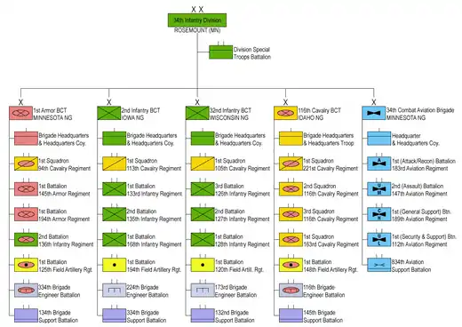 34th Infantry Division exercises training and readiness oversight of the following elements, but they are not organic[39] and include a division headquarters battalion, one armored brigade combat team, two infantry brigade combat teams, a cavalry brigade combat team, a field artillery brigade, and several attached units—specifically a field artillery brigade, a maneuver enhancement brigade, and a regional support group—along with Companies A and B from the 2nd Battalion 123rd Armor Regiment in the Kentucky Army National Guard: