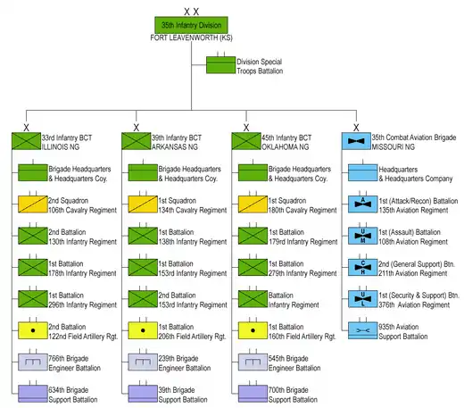 The 35th Infantry Division, formerly known as the 35th Division, is an infantry formation of the Army National Guard at Fort Leavenworth.