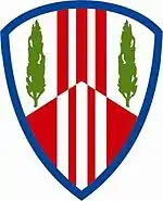 The shoulder sleeve insignia is an embroidered shield with a blue border blazoned with Argent and Gules chevron between three counterchanged palets (vertical bars), and two Vert poplar trees. It was approved for the 369th Sustainment Brigade on 7 February 2008.[5]