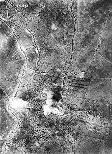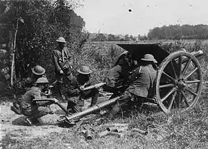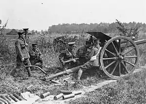 39th Divisional Artillery returned to the front on 1 September and was involved in all the fighting that month, even if the division's infantry were not.[41] Although there were minor operations, the next offensive phase (the Battle of the Menin Road Ridge) was delayed by the weather and the need to build up ammunition. This time the weight of artillery was doubled and the frontage of attack narrowed. There were significant casualties among the massed field batteries from CB fire in the days preceding the attack, but practice barrages were fired, and numerous trench raids were supported by the guns. Field gun barrages were fired at night to isolate German gun positions and prevent them resupplying. Once again 39th Division's role was to form a defensive flank, this time in the southern sector around Shrewsbury Forest. The attack started at 05.40 on 20 September. The creeping barrage consisted of five belts, the rearmost ('A', nearest the attacking infantry) being fired by half the 18-pdrs, of which one-third of the batteries were 'superimposed' so that they could be redirected to fire at targets of opportunity without leaving a gap in the barrage. The 'B' barrage line 200 yards (180 m) ahead was provided by the 4.5s and the rest of the 18-pdrs. It was impressed on the infantry that they were to follow the barrage closely, and despite the muddy conditions the attack was a great success. The gunners were then able to break up German counter-attacks, despite their own exhaustion.[5][41][42][43][44][45]