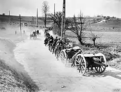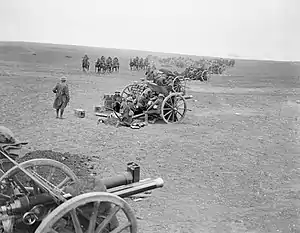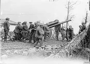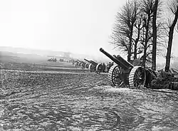 The opening bombardment of the German Spring Offensive on 21 March 1918 found 39th Division in reserve.[54] The units and formations in Fifth Army's Forward Zone were overwhelmed in the first hours and the reserves were sent up before the end of the day: 39th Division went to assist the hard-pressed 16th (Irish) Division, with 39th DA racing up to help.[55][56][57][54] Next day the Germans continued to advance and at 08.15 16th (Irish) Division was ordered to retire, covered by the guns of 39th DA. At 09.00 CLXXIV Bde was also ordered to withdraw, but with the exception of D (H) Bty they were unable to get limbers up to the gun positions, and therefore remained in action until the infantry had withdrawn past them, firing at whatever targets they could see. Eventually, with the enemy working round both flanks and harassed with machine gun fire, the detachments withdrew, taking their breech blocks and sights, having to abandon 16 18-pdrs. Having withdrawn, D Bty brought its howitzers back into action and continued to fire on the advancing enemy troops. Two remaining 18-pdrs of C Bty had been in the workshops, and these were brought into action in a fresh position alongside guns and howitzers of another brigade. Meanwhile, CLXXXVI Bde's limbers had been closer, and the brigade was able to withdraw, having remained in action until the enemy infantry were within 300 yards (270 m).[54][58]