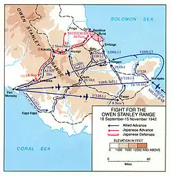 Although the Japanese were experiencing similar problems in relation to supplies, they began their advance once again on 26 August and despite several rugged defensive actions the Australians were forced back again, first to Eora Creek on 30 August, then Templeton's Crossing on 2 September, and finally to Efogi three days later.[24] Exhausted from their efforts and no longer able to be considered an effective fighting force, the 39th was relieved and sent down the track to Koitaki to rest.[24] They had done the job that was required of them, having stalled the Japanese advance in order to allow reinforcements to be brought up.[56][57] These reinforcements came in the shape of the 25th Brigade, comprising the 2/25th, 2/31st and 2/33rd Battalions.[58] Bitter fighting ensued around Ioribaiwa and the Australians withdrew once again on 17 September, this time to Imita Ridge; however, the Japanese had reached their limit and on 24 September began to withdraw.[24] The Australians subsequently launched a counter-offensive in October and by 2 November, Kokoda was back in Australian hands.[24]