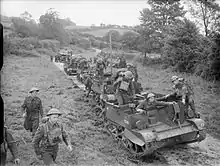 After Dunkirk, the battalion left the 23rd Division on 29 June 1940.[6] It was under command of Home Forces until November 1940 when it joined the 3rd Infantry Division, a Regular Army formation,[8] as a motorcycle battalion. The battalion was only of only two Territorial Army units in the division, the other being 76th (Highland) Field Regiment, Royal Artillery. On 30 April 1941 it was transferred to the Reconnaissance Corps and redesignated as 3rd Battalion, Reconnaissance Corps, on 6 June 1942 as 3rd Regiment, Reconnaissance Corps and finally on 1 January 1944 it was transferred to the Royal Armoured Corps as 3rd (Royal Northumberland Fusiliers) Reconnaissance Regiment.[9] It remained part of the 3rd Infantry Division until August 1945.[10]