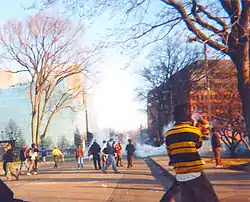 Protesters favouring the yellow or red zones headed south, towards Cap Diamant. Many spread out through the Saint-Jean Baptiste area north of and below the fence; others marched along the edge of the mountain on Côte d'Abraham towards its intersection with the Dufferin-Montmorency Autoroute, through which the fence passed. Peaceful protesters, including individuals running speaker's corners, were in great numbers throughout this area during the afternoon.