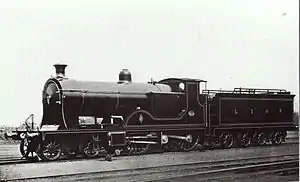 This very unusual wheel arrangement was used by Dugald Drummond of the London and South Western Railway between 1897 and 1901 on two classes of divided drive locomotives, the T7 and E10 classes. The absence of coupling rods enabled the driving wheels to be more widely spaced than on a 4-4-0 locomotive and permitted the inclusion of a larger firebox[1]