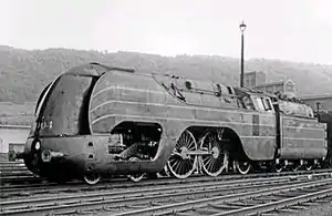 In 1939, the National Railway Company of Belgium (NMBS/SNCB) introduced six Class 12 streamlined Atlantic locomotives on the fast lightweight boat trains that ran on the 124 kilometres (77 miles) line between Brussels and Ostend.[6] Designed by Raoul Notesse to be capable of speeds of 120 to 140 kilometres per hour (75 to 87 miles per hour) and based on the successful Canadian Pacific Railway 4-4-4 Jubilee type semi-streamlined locomotives, but incorporating the ideas on streamlining of André Huet, they were built by John Cockerill at Seraing. They were fully streamlined, except for openings to provide access to the valve gear and motion, and had inside cylinders with outside valve gear to reduce oscillation at speed. The class remained in service until 1962.[7][8]
