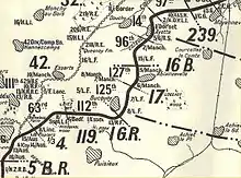 By December 1916, the 42nd Division was furnishing units to protect the lines of communication at Salmana, Abu Tilul and the railway station Maadan and took part in a practice attack on 13 December. On 21 December, 42nd and 52nd Divisions marched from Kilo 128 to Bardawil and continued to move eastwards towards Masaid.[39]