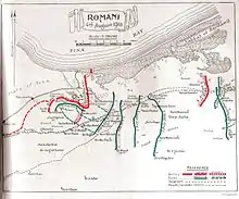 The 42nd Division served at Kantara on the Suez Canal in No. 3 Section of the Suez Canal Defences under General Lawrence until they were entrained for the railhead at Pelusium on the first day of the Battle of Romani on 4 August 1916.[22][23][24]