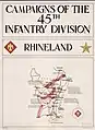 After the crossing was complete, the division was relieved from V Corps and assigned to Major General Wade H. Haislip's XV Corps.[49] The division was allowed a one-month rest, resuming its advance on 25 November, attacking the forts north of Mutzig. These forts had been designed by Kaiser Wilhelm II in 1893 to block access to the plain of Alsace. The 45th Division next crossed the Zintzel River before pushing through the Maginot Line defenses.[39] During this time much of the division's artillery assets were attached to the 44th Infantry Division to provide additional support.[55] The 45th Infantry Division, now commanded by Major General Robert T. Frederick, who had previously commanded the 1st Special Service Force, was reassigned to VI Corps on New Year's Day.[49] From 2 January 1945, the division fought defensively along the German border, withdrawing to the Moder River.[39] It sent half of its artillery to support the 70th Infantry Division.[55] On 17 February the division was pulled off the line for rest and training. Once this rest period was complete, the division was assigned to XV Corps for the final push into German territory.[49] The 45th moved north to the Sarreguemines area and smashed through the Siegfried Line, on 17 March taking Homburg on the 21st and crossing the Rhine between Worms and Hamm on the 26th.[39] The advance continued, with Aschaffenburg falling on 3 April, and Nuremberg on the 20th.[39] The division crossed the Danube River on 27 April, and liberated 32,000 captives of the Dachau concentration camp on 29 April 1945.[39] The division captured Munich during the next two days, occupying the city until V-E Day and the surrender of Germany.[56] During the next month, the division remained in Munich and set up collection points and camps for the massive numbers of surrendering troops of the German armies. The number of POWs taken by the 45th Division during its almost two years of fighting totalled 124,840 men.[39] The division was then slated to move to the Pacific theater of operations to participate in the invasion of mainland Japan on the island of Honshu, but these plans were scrubbed before the division could depart after the surrender of Japan, on V-J Day.[57]