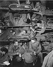 Initially, the division was used to provide a pool of reinforcements for the divisions which had been sent to the Korean War theater, and in January 1951 it provided 650 enlisted fillers for overseas service. Later that month, it was given 4,006 new recruits for its three infantry regiments and artillery assets, and each unit created a 14-week training program to prepare these new soldiers for combat.[89] Because of heavy casualties and slow reinforcement rates, the Army looked to the National Guard to provide additional units to relieve the beleaguered Eighth Army. At the time, the 45th Infantry Division was comprised overwhelmingly of high school students or recent graduates and only about 60 percent of its divisional troops had conducted training and drills with the division for a year or more. Additionally, only about 20 percent of its personnel had prior experience of military service from World War II.[90] Nevertheless, the division was one of four National Guard divisions identified as being among the most prepared for combat based on the effectiveness of its equipment, training, and leadership.[91] As a result, in February 1951, the 45th Infantry Division was alerted that it would sail for Japan.[92]