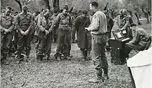 The division was subsequently assigned a lead role in the amphibious assault on Sicily, coming ashore on 10 July.[29][30] Landing near Scoglitti, the southernmost U.S. objective on the island, the division advanced north on the U.S. force's eastern flank.[31] After initially encountering resistance from armor of the Herman Goering Division, the division advanced, supported by paratroopers of the 505th Parachute Regimental Combat Team, part of the 82nd Airborne Division, who landed inland on 11 July.[32] The paratroopers, conducting their first combat jump of the war, then set up to protect the 45th's flank against German counterattack, but without weapons to counter heavy armor, the paratroopers had to rely on support from the 2nd Armored Division to repulse the German Tiger I tanks.[32] As the division advanced towards its main objective to capture the airfields at Biscari, and Comiso, German forces pushed back.[33] For most of the first two weeks while the division moved slowly north, it encountered only light resistance from Italian forces fighting delaying actions.[34] Italian and German forces resisted fiercely at Motta Hill on 26 July, however, and for four days the 45th Division was held up there.[35] After this, the division was allocated to drive towards Messina, being ordered by the Seventh Army commander to cover the distance as quickly as possible.[36] The 45th Division spent a few days in that city, but on 1 August, the division was withdrawn from the front line for rest and rear-guard patrol duty,[26] after which the division was assigned to Major General Ernest J. Dawley's VI Corps, part of the U.S. Fifth Army, under Lieutenant General Mark W. Clark, in preparation for the invasion of mainland Italy.[37]