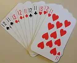 Special decks of cards were created by the United States Playing Card Company for playing six-handed 500, using a total of 63 cards. Besides using all 52 cards of the standard poker deck, plus one joker, these sets include 11s, 12s, and red 13s (a variation of their 61-card packs, with no red 13-spot cards, patented in 1881, that had been sold with rules for a forerunner of 500, and updated in 1897 to include red 13s[9]). Each player receives 10 cards, and the kitty receives 3. Players seated in alternating positions around the table form two teams of three players each (or three teams of two, in "Cut Throat Six-Handed" 500). These decks are also made by Queen's Slipper, Piatnik, and Cartamundi. A variation is to use two jokers, the black-and-white one ranking highest.