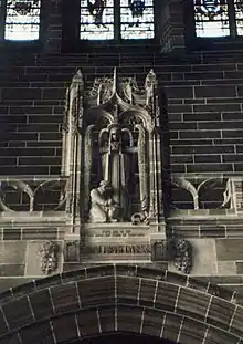 In September 1919, the division's comrades' association decided that two memorials would be erected: one in Liverpool, and a second in Givenchy-lès-la-Bassée. The memorial in France was constructed on land near the town's church and unveiled on 15 May 1921. The ceremony included an honour guard of division veterans, including Jeudwine, and guests including the Duchess of Sutherland, the Mayor of Liverpool, Marshal of France Joseph Joffre, and the mayors of Givenchy and other nearby towns.[169] The second (pictured), is a sandstone sculpture by Walter Gilbert that was installed in Liverpool Cathedral.[168]