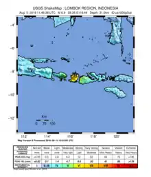 The earthquake occurred on 19:46 local time, at a depth of 31.0 km (19.3 mi) (USGS)[11] or 15.0 km (9.3 mi) (BMKG).[14] Shaking was felt as far away as Sumbawa in the east[15] and Trenggalek Regency in the west.[16][17] Shaking was also felt in Pacitan Regency, East Java.[18] The Indonesian Agency for Meteorology, Climatology and Geophysics (BMKG) stated that the epicentre of the earthquake was located inland, on the northeastern slopes of Mount Rinjani at 8.37°S 116.48°E. It initially measured the earthquake's intensity at Mw 6.8, before revising it to 7.0.[14][19] The United States Geological Survey initially measured the earthquake at Mw 7.0, before revising it down to 6.9. It placed the epicenter at 8.287°S 116.451°E, somewhat north of the BMKG estimate.[11][20]