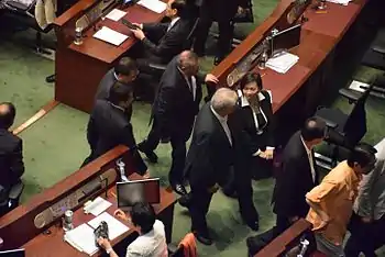 On 18 June 2015, right before the vote, pro-Beijing legislator Jeffrey Lam Kin-fung led a walk-out of members of the Democratic Alliance for the Betterment and Progress of Hong Kong (DAB), the Business and Professionals Alliance for Hong Kong (BPA), most members of the Hong Kong Federation of Trade Unions (FTU) and other pro-Beijing legislators, leaving five Liberal Party legislators, Chan Yuen-han of the FTU and two other pro-Beijing independents remained in the chamber. The government's reform proposal failed as 8 legislators voted in favour and 28 votes against.[16] All 27 pan democrats who had vowed to vote down the reform did so, as did one pro-Beijing legislator Leung Ka-lau representing the Medical constituency. Lam explained that the walk-out was an impromptu attempt to delay the division after the chairman denied his request for a 15-minute recess so that his party member Lau Wong-fat, who was delayed, could cast his vote in favour of the Beijing-backed reforms.[17] However, enough legislators remained in the chamber that quorum was met and the proposal was voted down while most of the pro-Beijing legislators were outside. Nine pro-Beijing legislators, including five Liberal Party members, stayed behind out of confusion, and only eight of them voted in favour of the package, giving the rest of the world the false impression there was no support for the blueprint.[18]