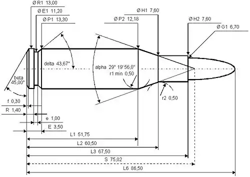 Americans would define the shoulder angle at alpha/2 ≈ 14.53 degrees. The common rifling twist rate for this cartridge is 250 mm (1 in 9.84 in), 4 grooves, Ø lands = 6.45 mm, Ø grooves = 6.70 mm, land width = 3.50 mm and the primer type is large rifle magnum.
