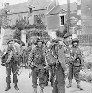 On 22 August a patrol from the 13th Parachute Battalion succeeded in crossing the eastern branch of the river, and was quickly reinforced by the rest of the battalion. They fought for three hours to gain a proper foothold and were then forced to withdraw again.[26] The next day, patrols from the 7th Parachute Battalion discovered that the Germans had withdrawn during the night, and they therefore crossed the river and secured the high ground to the north, closely followed by the rest of the brigade.[27] On 25 August the 1st Special Service Brigade took over as the lead formation, and headed towards Beuzeville, but once again German defences held up the advance. The 3rd Parachute Brigade and the 4th Special Service Brigade carried out a left flanking attack to capture the village, suffering heavy losses from German mortar fire.[28]