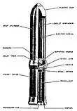 The Propagandagranate 41 was constructed of a plastic nose cone which held 200 leaflets weighing .23 kg (8 oz) that were rolled around a coiled spring and a metallic base which held the solid rocket. When the rocket was fired propellant gasses were forced through a steel base plate that had angled venturis drilled in it to impart spin.[2] A delay fuse was also ignited and a bursting charge separated the nose cone from the base at an altitude of 100–150 m (330–490 ft), the spring then uncoiled to scatter the leaflets.[1]