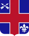 Blue is the color used for Infantry. The red cross appears on the Norwegian flag and alludes to the 3d Battalion (99th Infantry Battalion), constituted and activated in 1942, and composed of the citizens of Norway living in the United States and Norwegian speaking Americans. The make-up of the remainder of the Regiment was American personnel from the joint Canadian-American 1st Special Service Force; signified by its badge of two crossed arrows. The fleur-de-lis represents the Regiment’s European battle honors awarded for service during World War II. The motto translates "Bold and Brave."