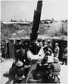 In June 1939, as the international situation worsened, a partial mobilisation of Anti-Aircraft Command was begun in a process known as 'couverture', whereby each TA AA unit did a month's tour of duty in rotation to man selected gun positions.[11][12] 79th (HY) AA Regiment was embodied on 25 June for a partial deployment to gunsites along the south bank of the Thames Estuary, with RHQ at Fort Borstal. The availability of equipment at the gunsites was invaluable for training the recruits, and the second half of the month's embodiment was spent at the AA Practice Camp at Bude in Cornwall.[13]