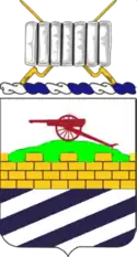 - Shield: Per fess Argent and Azure, a fess embattled to chief Or masoned Sable between in chief a field gun Gules on a mount Vert and in base three bendlets sinister of the first.
