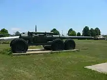 In 1919, the Westervelt Board described the ideal heavy gun for future development having a bore of 194 mm to 8 inches, a projectile of about 200 lbs in weight, and a range of 35,000 yards. More striking was the requirement that it be road transportable. At this time no other country had such a road-transportable field gun.[1] Low-priority design work occurred until 1924. Serious development began in June 1940 of an 8-inch (203 mm) gun that would have a range of 33,500 yards (30,600 m), a road speed of 25 mph (40 km/h), be transported in two loads weighing no more than 44,000 lb (20,000 kg) and be suitable for rail movement. The gun used the same projectile as the 8-inch coastal gun and the US Navy's 8-inch cruiser gun.[2] Using the same carriage as the 240 mm howitzer M1 eased development, but the gun was very troublesome and was not standardized until January 1942. The main problems were excessive bore wear and poor accuracy, but it was felt that nothing better could be produced in a timely manner. Thus it entered production at a low rate and in small numbers. The gun tube was produced by Watervliet Arsenal, and the recoil system was produced by Hannifin Manufacturing. Watertown Arsenal, Bucyrus-Erie, and the S. Morgan Smith Company manufactured the carriage. Only 139 weapon systems were produced before production ceased in 1945.[3]