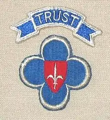 TRUST units, which included a number of 88th divisional support units, all bore a unit patch which was the coat of arms of the Free Territory of Trieste superimposed over the divisional quatrefoil, over which was a blue scroll containing the designation "TRUST" in white.
