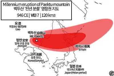 The 946 eruption of Paektu Mountain in Korea and China, also known as the Millennium Eruption or Tianchi eruption, was one of the most powerful volcanic eruptions in recorded history and is classified as a VEI 7 event. The eruption resulted in a brief period of significant climate change in Manchuria. The year of the eruption has not been precisely determined, but a possible year is A.D. 946.[1]