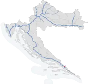 | Dubrovnik‑Neretva | 0.4 | Nova Sela border crossing | Nova Sela border crossing to Bosnia and Herzegovina, where the road continues as the A1 motorway towards Mostar. The eastern terminus of the motorway. | ||