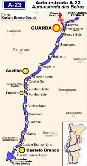 The A23 (Portuguese: Auto-Estrada da Beira Interior) is a motorway (freeway) in Portugal. It connects Guarda, at the A25 motorway (near the Spanish border), to Torres Novas at the A1, the main motorway of Portugal.