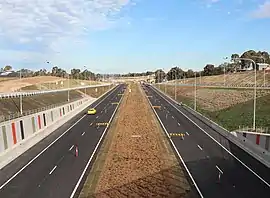 As part of the Western Sydney Infrastructure Plan, 35 km (21.7 mi) of The Northern Road will be upgraded to a minimum of four lanes between The Old Northern Road at Narellan and Jamison Road at South Penrith.[3][4] The project is being delivered in six stages, with the first stage at Oran Park completed in April 2018.[5] In April 2020, the Northern Road was also realigned between Mersey Road and Eaton Road at Luddenham, to facilitate the construction of Western Sydney Airport.[6][7] On 16 July 2020, The Northern Road and Bringelly Road interchange opened including a realignment of The Northern Road.[8] On 13 December 2020, The Northern Road was realigned between Elizabeth Drive and Eaton Road was opened to traffic, bypassing Luddenham.[9]