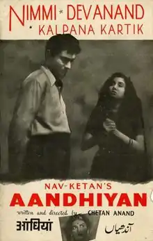 Aandhiyan (English: Cruel Winds) is a 1952 Hindi drama, written and directed by Chetan Anand. The story was written by Chetan Anand and Hameed Butt, based on an actual event in Amritsar.[1] It starred Dev Anand, Nimmi and Kalpana Kartik in lead roles.[2] The music of the film was from a classical musician Ali Akbar Khan, with lyrics by Narendra Sharma.