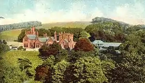The house was designed by the Lancaster architect E. G. Paley, and built between 1857 and 1859 for Sir James Ramsden.[1] Ramsden was an industrialist who played a large part in running the Furness Railway, eventually becoming its managing director, and in the iron and steel and shipbuilding industry in Barrow-in-Furness.[2] The Furness Railway contributed £2,000 (equivalent to £190,000 in 2019)[3] towards its cost, although Brandwood et al. consider that it must have cost much more.[4] The same authors also suggest that the house was used by the railway as a showpiece, and that clients would have been entertained there.[5] In 1874 Paley's architectural practice drew up plans for an addition to the North Lodge on the estate,[6] and in 1882 plans for a new morning-room for the house, which was built on its southeast corner.[7][lower-alpha 1] After James Ramsden's death in 1896, the house and estate passed to his son, Frederick, who did not marry, and who died in 1941. The house was used by the army during the World War II as can be seen by the presence of disused camp sites within the grounds on later 1950s Ordnance Survey maps, and later a convalescent home. The manor's condition subsequently deteriorated, and it was demolished using dynamite[9] in 1961 by Barrow Corporation.[10] Much of the manor's footings however remain visible giving a clear indication of its original scale. Some of the estate buildings were left standing, including four lodges, the home farm, and cottages, all of which had been designed by the Lancaster practice. [11] Some internal furnishings from the manor made by Gillows of Lancaster and London were transferred to Barrow Town Hall and even the Art Institute of Chicago.[12] The grounds of the estate are now maintained as a Country Wildlife Site by the Cumbria Wildlife Trust.[13]