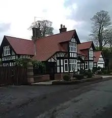 Abbot's Wood was a large complex building, incorporating elements of Gothic and Tudor architecture. There were many gables and roofs, a square tower with a taller stair turret and a particularly long conservatory.[1] Of the surviving estate buildings, three are recorded in the National Heritage List for England as designated Grade II listed buildings; two of the lodges and the home farm. The North Lodge, with its attached gatehouse and wing walls, is constructed in sandstone, and is in Gothic Revival style. The gatehouse has two storeys, with an archway in the lower storey. The upper storey contains a niche for a statue, which is flanked by a single-light window on each side. The single-bay gabled lodge to the right has a red tiled roof, and mullioned and transomed windows.[14] The South Lodge is half-timbered on a sandstone plinth, and has a red tiled roof. It is in two storeys, the front being gabled with a decorated bargeboard. The windows are transomed casements, and there is a four-light oriel window on the left side.[15] The Home Farm is built in sandstone with red tiled roofs. It consists of a cottage with a single storey and an attic, a shippon and calf house, a barn, pigsties, a stable, and a cart shed. These are all set in a U-shape around a courtyard.[16]