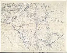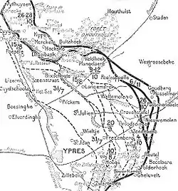 The German 40th Division and elements of the 58th Division held the line opposite the French, north of Mangelaere, where the 201st Infantry Regiment (General Marindin) of the 1st Division, was to advance on a line from the Faidherbe crossroads next to the British to ferme Papagoed (Butterfly Farm). The regiment was to capture several redoubts towards the farm at point 86.15, north of the Faidherbe crossroads on the right, to the ruins of Jean Bart Farm on the left. The preliminary bombardment was so effective that the French objectives were quickly taken, despite machine-gun fire from ferme Surcouf on the left.[37] The French joined in the British attack east of Veldhoek and helped to reduce a number of pillboxes; resistance was encountered at Panama Farm, north-east of Veldhoek but this was soon overrun. In the afternoon, patrols, often up to their waists in water, reached the fringes of Houthulst Forest, 1,100 yd (1,000 m) from the jumping-off point and captured two field guns and several prisoners.[38] The two regiments of the 1st Division in reserve sent parties forward to capture crossings along the Corverbeek on the left.[39] A British platoon had been provided for liaison with the 201st Infantry Regiment and when the French reached their objectives, Marindin sent two companies to form a defensive flank from Louvois Farm to Obtuse Bend.[40]