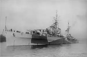 At Bergen, Z31 received initial repairs, which included removing the wreckage of her forward turret.[2] She departed the town on 8 February bound for Horten. After arriving safely in this port she received further repairs and had her anti-aircraft armament upgraded. Her forward turret was not replaced, but a 4.1 in (100 mm) gun was mounted instead; this was intended to be a temporary measure but remained in place for the remainder of her career.[10][13] After these repairs were completed, Z31 eventually reached Gotenhafen on 15 March.[2] The last German destroyer remaining in northern Norwegian waters, Z33, sailed for Germany on 5 February 1945 but ran aground while en route and suffered further damage in the Allied "Black Friday" air raid on the ninth of the month. Following repairs, she arrived at Swinemünde on 2 April.[14]