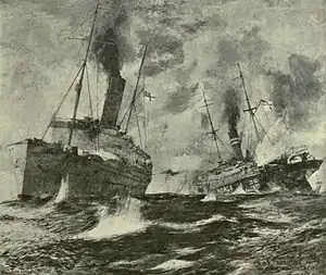 HMS Alcantara (left) and SMS Greif (right) duelling at close range