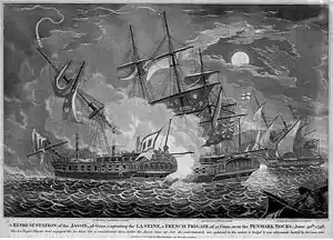 Throughout the day the chase continued, the British frigates gaining slowly on their quarry and as darkness fell Pique closed with the larger French ship. At 23:00 Milne was close enough to open fire on Seine, to which Bigot responded without reducing speed.[11] For the next two and a half hours the frigates exchanged broadsides at full speed as the French coastline rapidly approached ahead. At 01:35 a shot from Seine struck the main topmast on Pique, bringing it crashing down. The consequent loss of speed forced Milne back, Seine pulling away from the smaller ship but unable to escape Jason which was steadily gaining.[12]