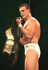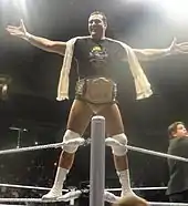 On December 16 at TLC: Tables, Ladders & Chairs, Del Rio turned face for the first time in his WWE career, when he saved Ricardo Rodriguez and the Spanish announcers from 3MB (Drew McIntyre, Heath Slater, and Jinder Mahal). Later in the event, Del Rio teamed with The Miz and The Brooklyn Brawler to defeat 3MB in a six-man tag team match.[117] The next night on Raw, Del Rio and Miz teamed up with Tommy Dreamer to defeat 3MB in another six-man tag team match.[118] On the December 28 episode of SmackDown, Ricardo Rodriguez was awarded a title match against World Heavyweight Champion Big Show, but Show knocked Rodriguez out backstage. Del Rio was then awarded the title match in Rodriguez's place, however, the match ended in a no contest after Sheamus attacked Big Show.[119] On the December 31 episode of Raw, Big Show chose to defend his title against Ricardo Rodriguez. As Rodriguez was about to lose the match, Del Rio attacked Big Show from behind, causing a disqualification and re-igniting a feud between Del Rio and Big Show.[120] On the January 11 episode SmackDown, as Del Rio's character transitioned into a hero of the Latino fanbase,[121] he defeated Big Show in a Last Man Standing match to win his first World Heavyweight Championship.[122][123] Del Rio made his first successful title defense on January 27 at the Royal Rumble, defeating Big Show in another Last Man Standing match, after Rodriguez duct taped Show's legs to the ropes.[124] After repeated attacks from Big Show to both himself and Rodriguez, Del Rio and Big Show faced off in a singles match on February 17 at Elimination Chamber, where Del Rio submitted him to the cross armbreaker to retain his title.[125] Del Rio then began a feud with his new number one contender, Jack Swagger, over his opposing political views regarding immigration in America.[126][127][128][129][130] The feud escalated on the March 18 episode of Raw, when Swagger broke Rodriguez's ankle with his Patriot Lock submission.[131] Del Rio continued feuding with Swagger on the April 1 episode of Raw, defeating Swagger's manager Zeb Colter via disqualification after Colter hit Del Rio with Ricardo Rodriguez's crutch.[132] On April 7 at WrestleMania 29, Del Rio defeated Swagger via submission to retain the World Heavyweight Championship.[133] The next night on Raw, Del Rio defeated Swagger and Zeb Colter in a Two-on-one handicap match after forcing Swagger to submit to the cross armbreaker. After that, Del Rio lost the World Heavyweight Championship to Dolph Ziggler who cashed in his Money in the Bank briefcase, ending his reign at 90 days.[134] After losing the title, Del Rio would continue feud with Swagger and Ziggler over the title.[135][136][137] On the April 29 episode of Raw, Ricardo Rodriguez defeated Big E Langston and Zeb Colter in a three-way match to give Del Rio the right to choose the stipulation of his three-way match at Extreme Rules and chose a ladder match.[138] However, Ziggler would suffer a legitimate concussion at a SmackDown taping, thus removing their match from Extreme Rules.[139][140] In result of Ziggler's injury, Del Rio instead would be booked to face Swagger in a number one contender "I Quit" match at Extreme Rules on May 19,[141] which Del Rio won.[142] In the following weeks, Del Rio would face Ziggler's enforcer Big E. Langston in a series of matches, which Del Rio won 3-2.[143]