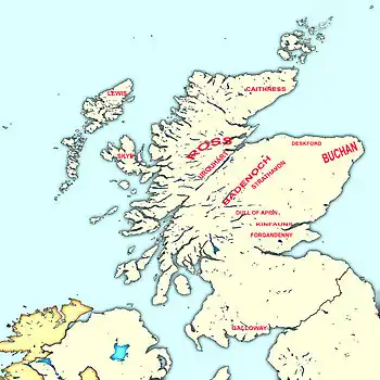Alexander de Ard, a principal claimant for the Earldom of Caithness as the eldest grandson of Earl Malise,[9] resigned his territories to the crown in favour of both Alexander and his half-brother David.[10] However Alexander effectively doubled his land holdings when he married Euphemia Countess of Ross, in June 1382.[5] Alexander became the jure uxoris Earl of Ross and this provided him the Ross lands (but only during his own lifetime). Other lands belonging to his wife – including Lewis, Skye, Dingwall and Kingedward in Aberdeenshire – he held in joint ownership with her.[11] His possession of the Barony of Kingedward, a large part of the former Earldom of Buchan allowed King Robert to give Alexander the title of Earl of Buchan only days after his marriage.[12][13] Alexander ruled these territories with the help of his own private cateran forces, building up resentment among other land owners and this included Alexander Bur, Bishop of Moray.[7]