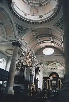 Built in the style of Christopher Wren's London churches rebuilt after the Great Fire of London,[3] it has in the past been mistakenly attributed to him.[4] The rebuilding of the city churches was initiated by financing of the Rebuilding of London Act 1670. Wren, as Surveyor General of the King's Works, undertook the operation, and one of his first London churches was St Mary-at-Hill.